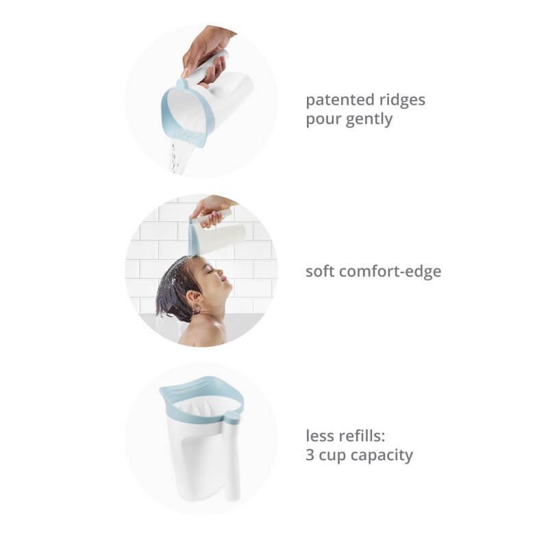 Designed to keep water away from little eyes and ears as you rinse, the Skip Hop Wave Waterfall Bath Rinser features a streamlined shape with patented interior ridges for a gentle pour. A soft-comfort edge cushions your little one’s forehead, while the large rinse cup size holds plenty of water (and less need for refills)! Pair our bath rinser for baby with our coordinating Wave 4-in-1 Baby Tub for easy and stylish bathtime.